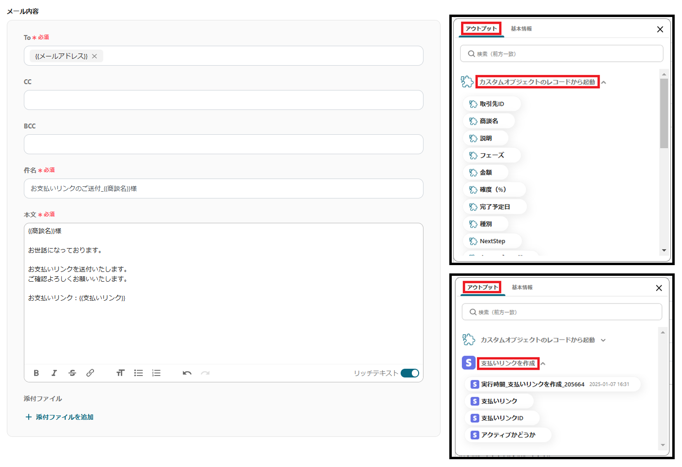 ※Salesforceに登録された内容を設定する場合は、枠をクリックして表示されるアウトプットの「カスタムオブジェクトのレコードから起動」から選択します。(値は二重括弧で表示されます)