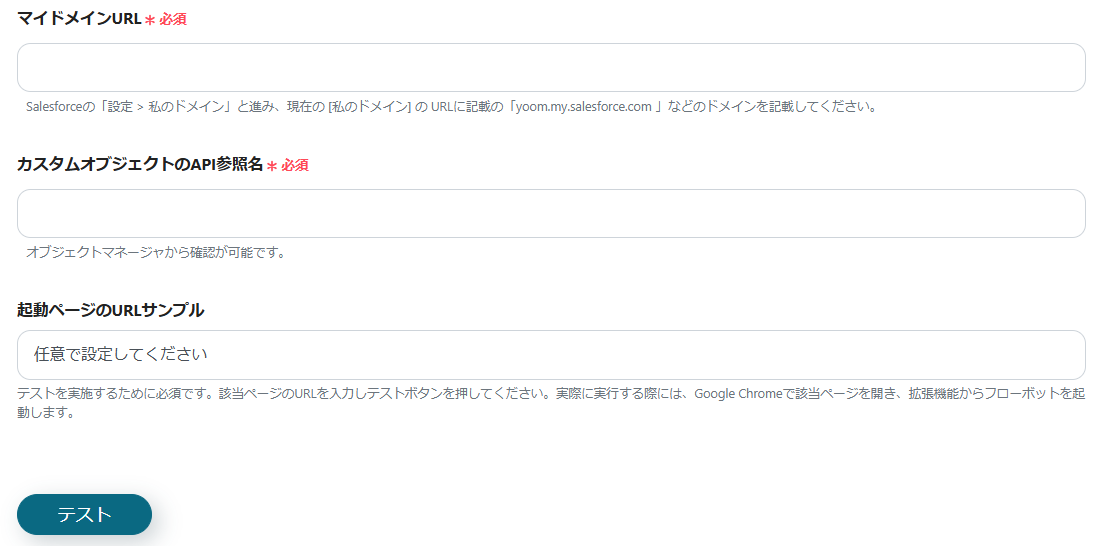 7.マイドメインURL、カスタムオブジェクトのAPI参照名、起動ページのURLサンプルを設定し、テストを行います。