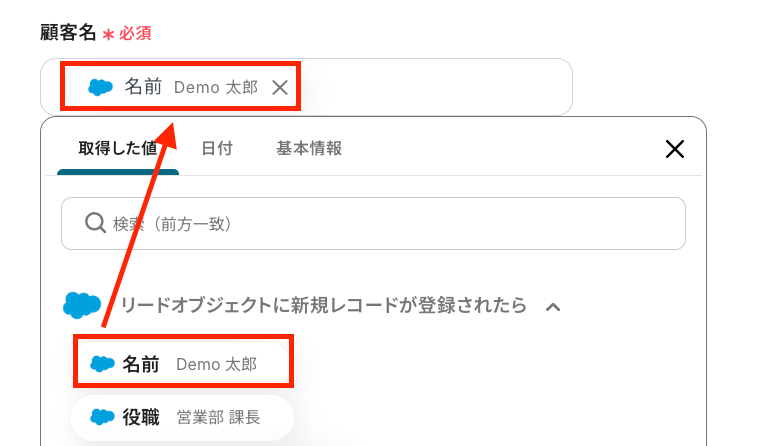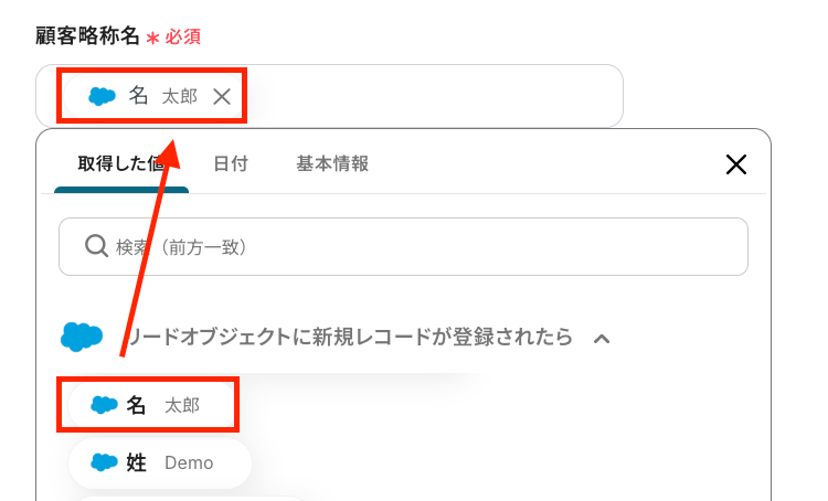 顧客名:boardに自動登録する顧客名を、下図のように取得した値を用いて設定します。