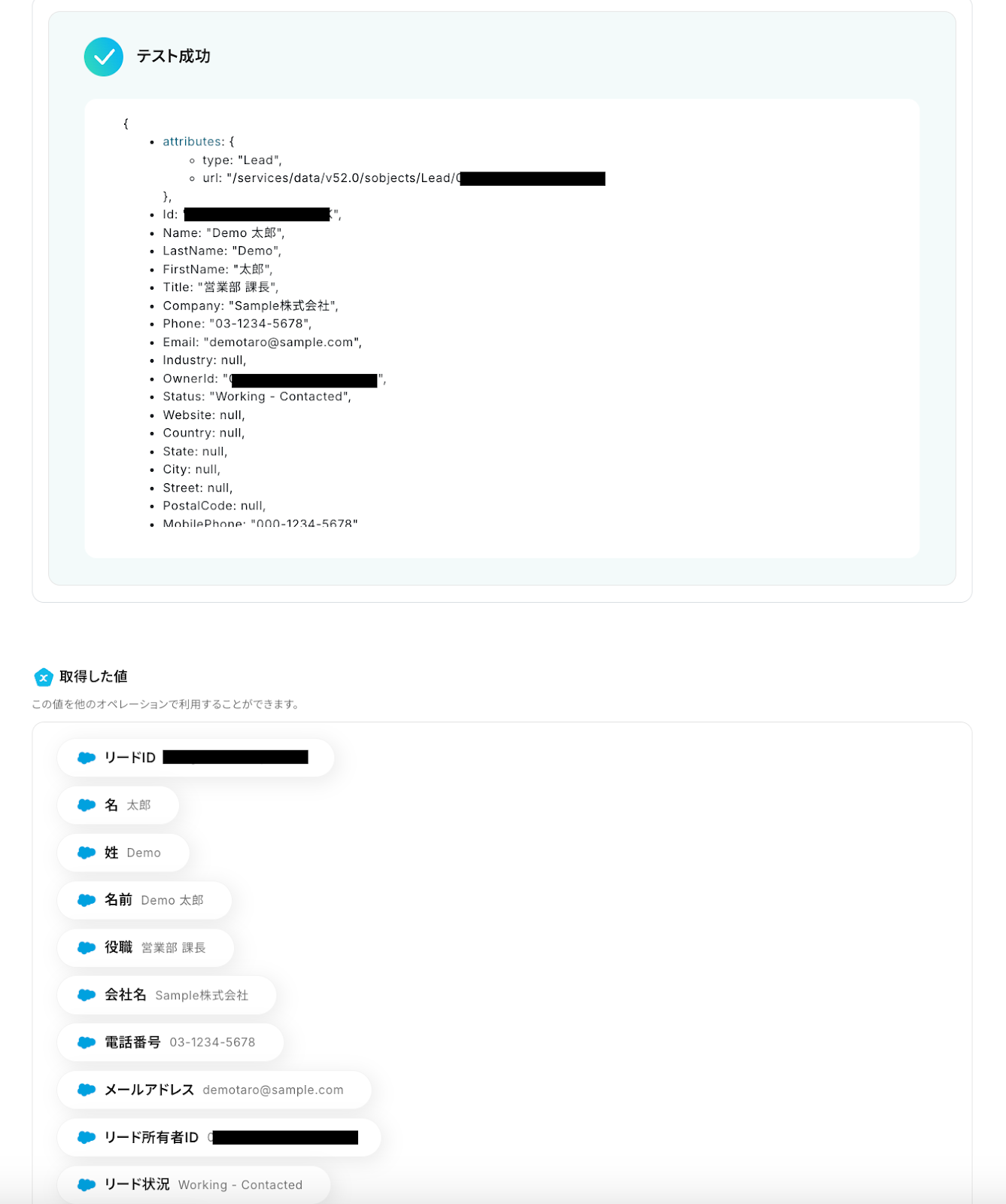 作成できたらYoomの画面に戻り、テストボタンをクリックしましょう。テストが成功すると取得した値が表示され、Salesforceのデータが確認できます。