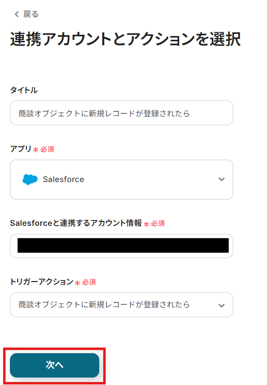 アカウント情報の項目にはステップ1でマイアプリ連携したSalesforceのアカウント情報が自動で表示されます。