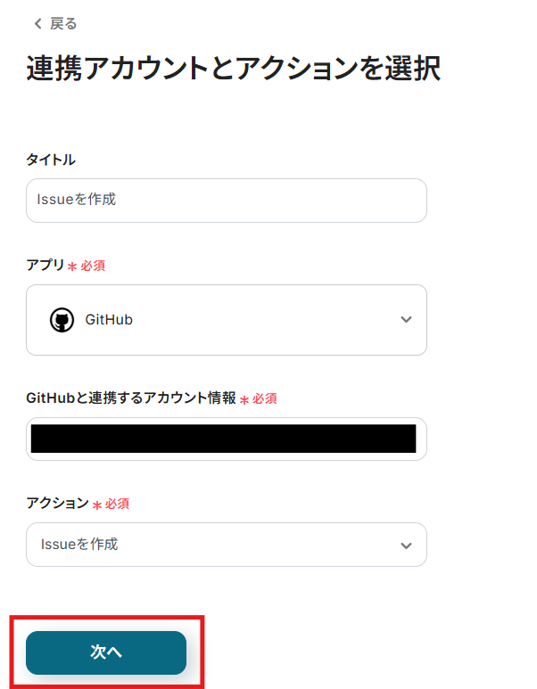 トリガーアクションは「Issueを作成」のままで次に進みましょう!