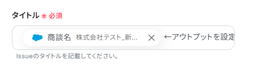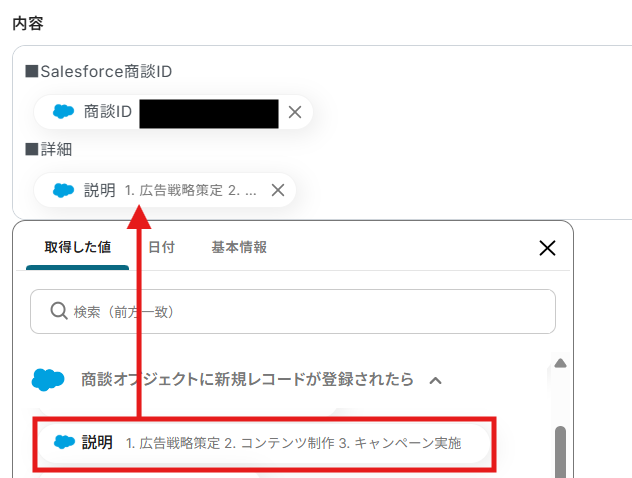 このようにアウトプットを活用することで最新のデータをその都度Salesforceへ自動登録可能となります。なお、テキストを直接入力した部分は固定値とされるため、下記画像のように「Salesforce商談ID」や「詳細」などは手入力し、毎回変動することが望ましい「商談ID」や「説明」などはアウトプットを活用しましょう。