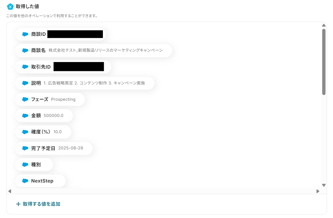 テストが成功すると、取得した値の横にSalesforceに登録した商談の詳細情報が表示されます。