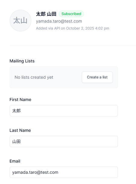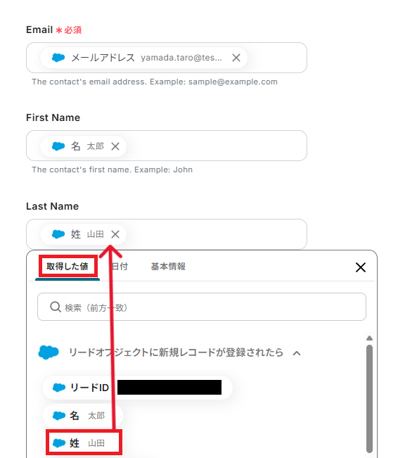 「Email」「First Name」「Last Name」を、それぞれ取得した値から設定 しましょう。 取得した値を活用することで、固定値ではなく、トリガーが実行されるたびに最新の情報が反映されます。