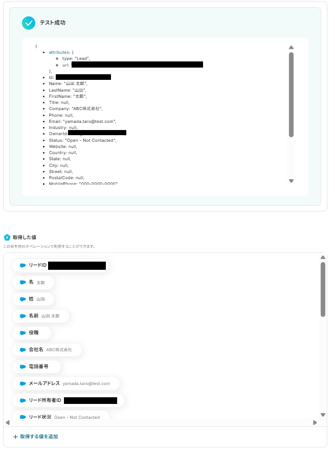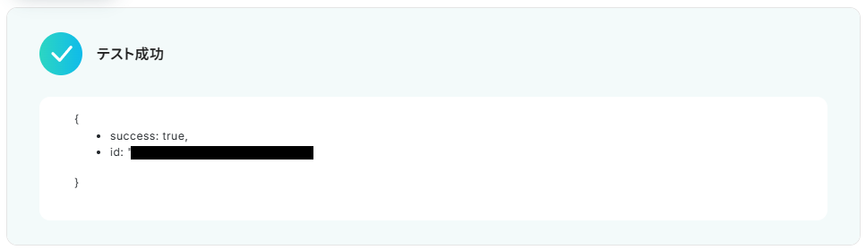 テストが成功すると、下記のようにテスト成功画面と取得した値が表示されます。 取得した値をこのあとの設定で使用し、Loopsとの連携を進めていきます!
