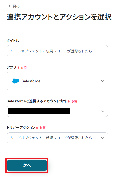 クリックすると以下の画面に切り替わります。「タイトル」は任意で変更も可能です。 Salesforceと連携するアカウントに間違いがないかを確認し、「次へ」をクリックしましょう。