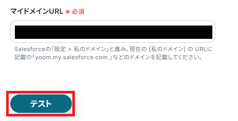 「マイドメインURL」を、注釈に記載されている内容に沿って入力してください。Salesforceの設定から確認できます。 ここまで入力が完了したら連携テストを行うため、テストボタンをクリックしましょう。