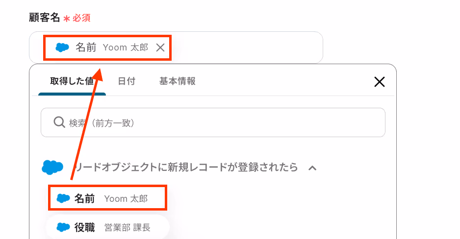 「顧客名」は、入力欄をクリックして表示される「取得した値」の「リードオブジェクトに新規レコードが登録されたら」内にある、「名前」を設定します。