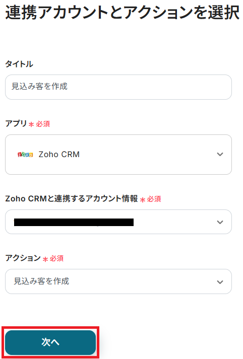ステップ3と同様、アクションは「見込み客を作成」のまま「次へ」をクリック。