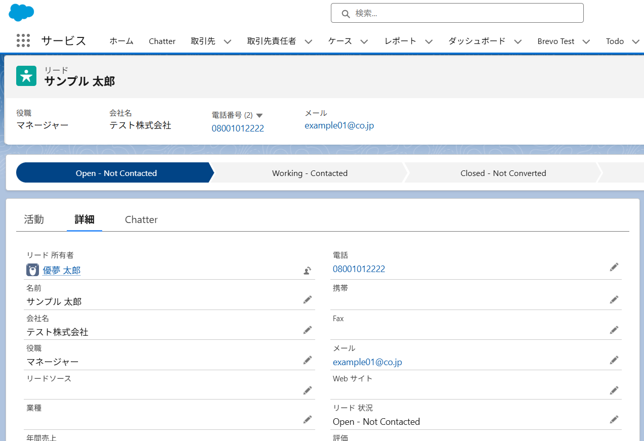 はじめに準備として、Salesforceにテスト用の新規リードを登録します。