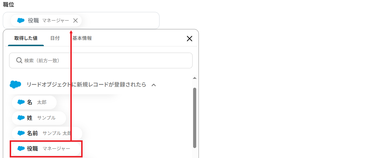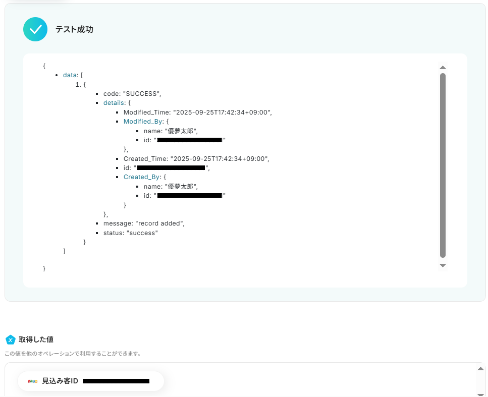 取得した値について、詳しくはこちらをご参照ください。なお、この取得した値はこの後の設定で活用でき、Zoho CRMに自動登録可能なデータです。