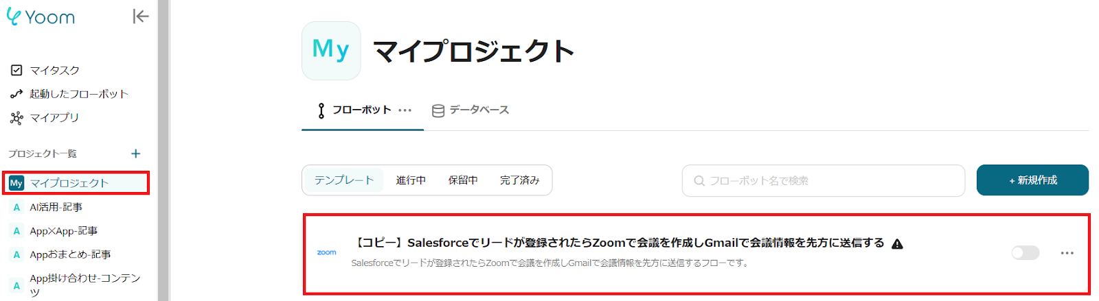 1.Yoom管理画面の左側から「マイプロジェクト」を選択し、「【コピー】Salesforceでリードが登録されたらZoomで会議を作成しGmailで会議情報を先方に送信する」をクリックします。