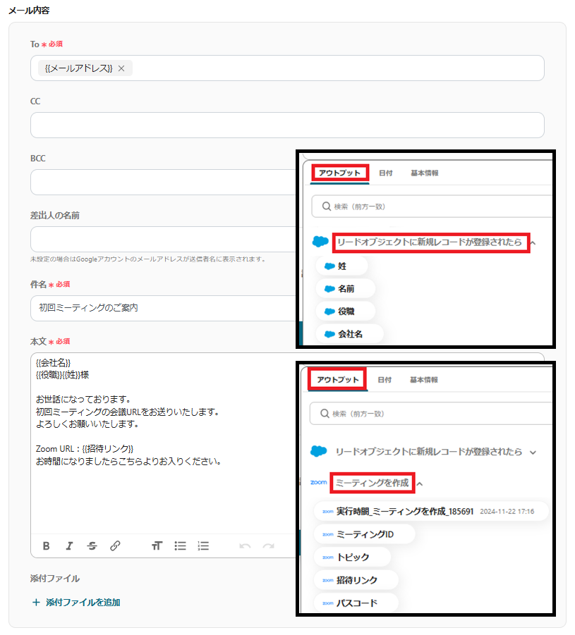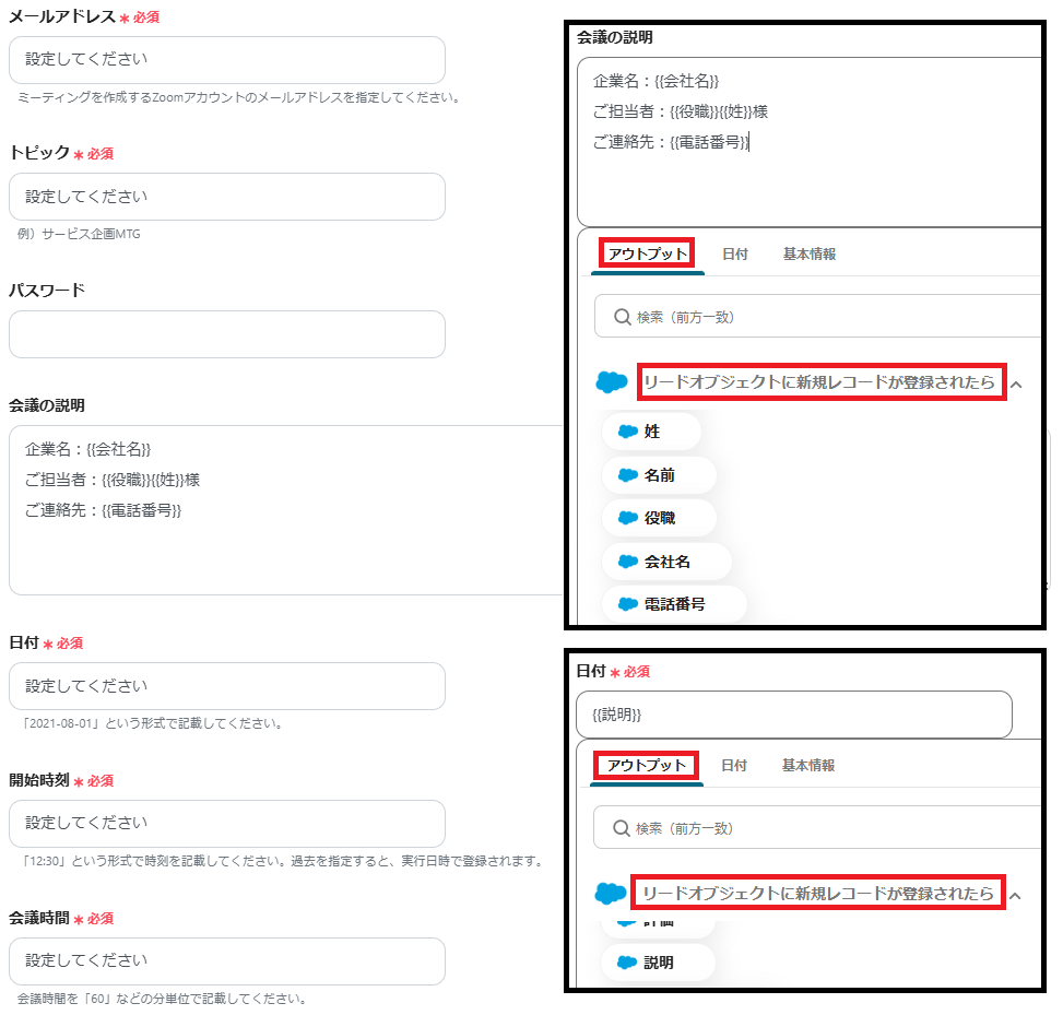 ※各枠をクリックすると、これまでの設定で取得した情報が「アウトプット」に表示されます。「リードオブジェクトに新規レコードが登録されたら」や「ミーティングを作成」の中から顧客ごとに変動する値を選択することで、動的に情報を反映できます。