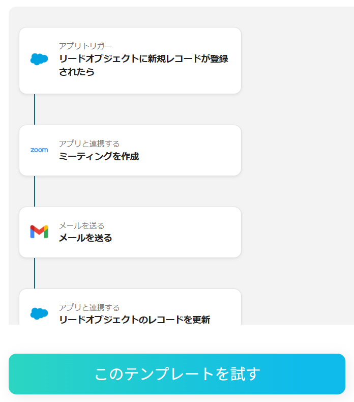 それでは、実際に「Salesforceでリードが登録されたらZoomで会議を作成しGmailで会議情報を先方に送信する」のテンプレートを使ったフローボットを作成していきましょう。
