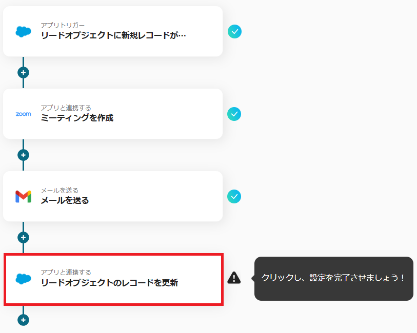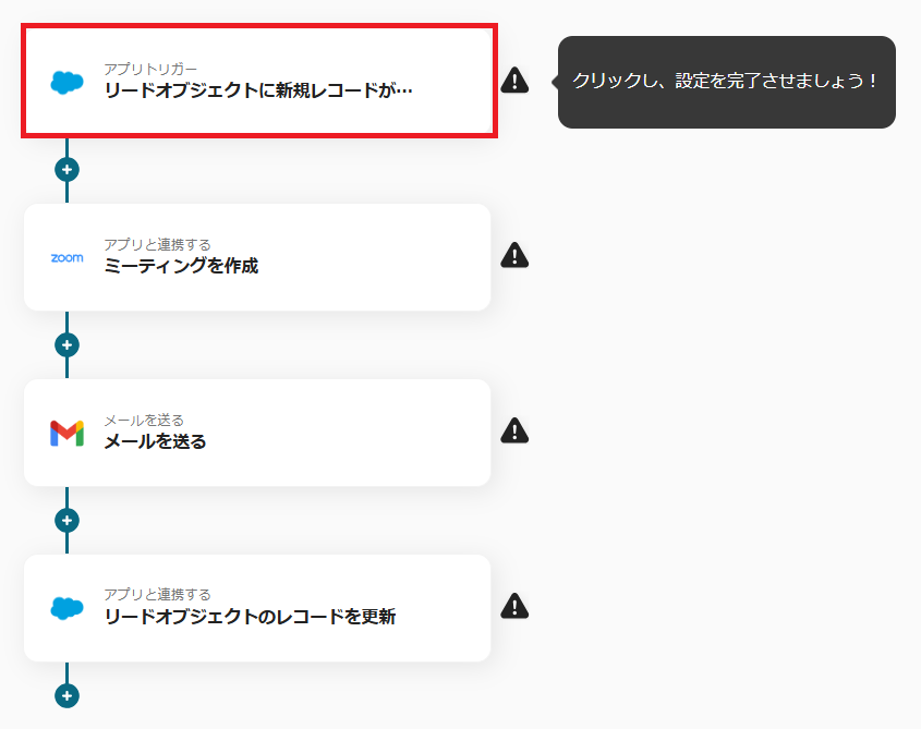 ※この自動化では、あらかじめSalesforceのリードオブジェクトにカスタムフィールド項目(日付など)を用意し、Zoom会議作成に必要な情報などがそこに存在していることを前提として作成しています。