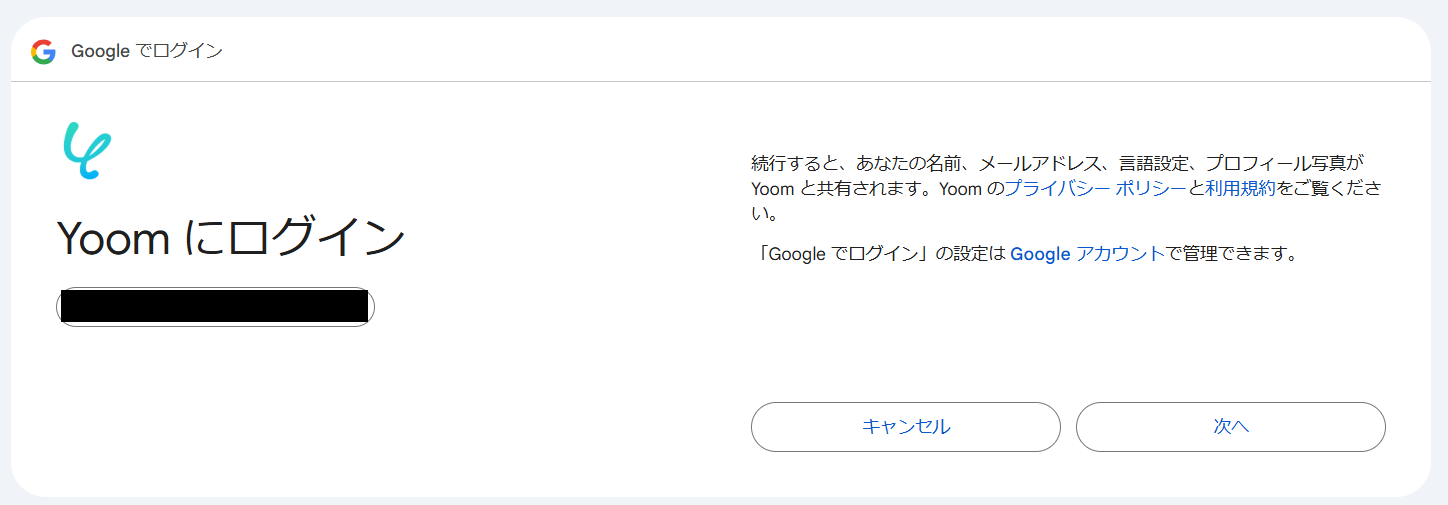 2.Zoom(OAuth)と連携するアカウントを選択して「次へ」をクリックします。