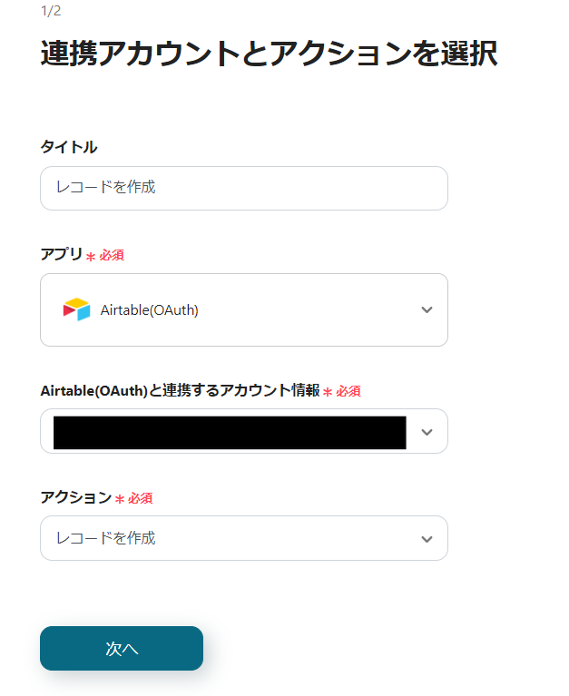 2) アクションは「レコードを作成」を選択して、「次へ」をクリックします。