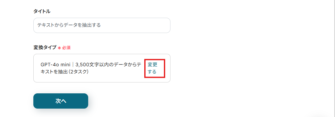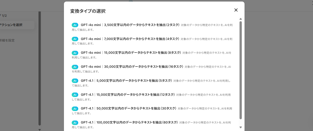 このステップでは、使用するGPTの種類と抽出元となるデータの文字数を選択していきます。