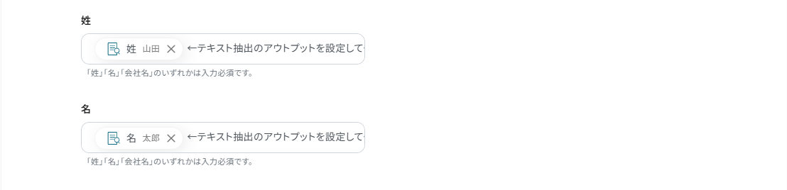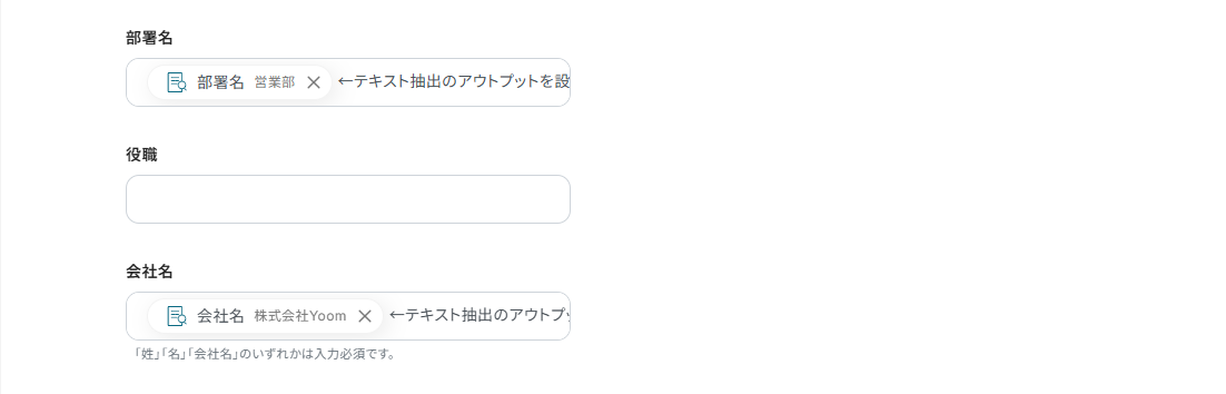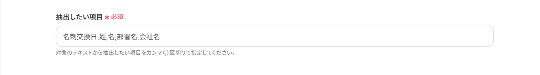 今回は、Sansanに名刺情報を自動で登録したいので、抽出したい項目には「名刺交換日,姓,名,部署名,会社名」を設定しています。