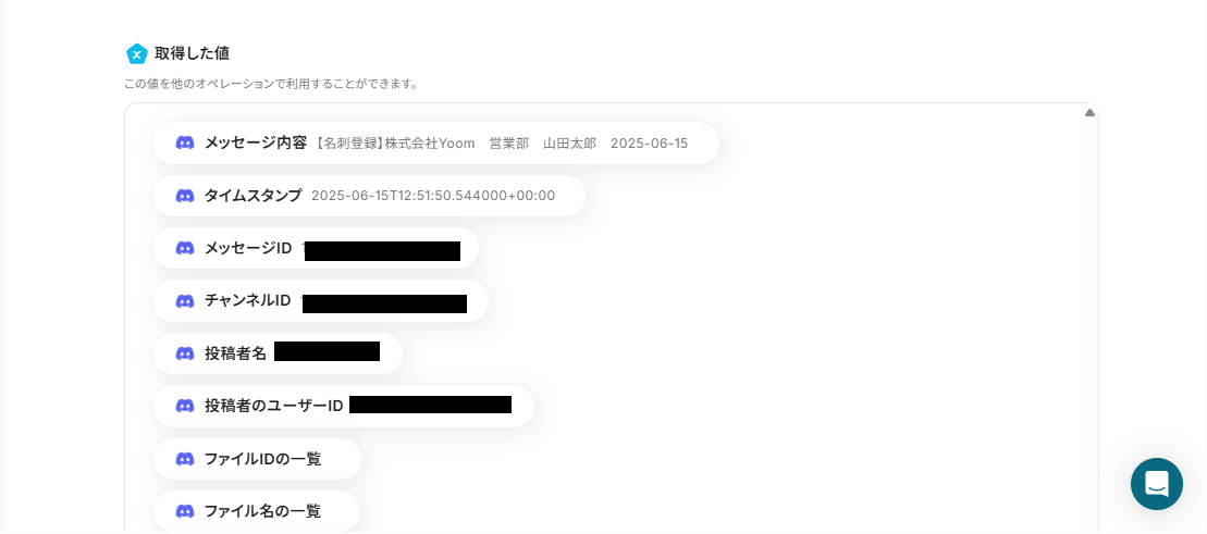 テストが成功すると、Discordのメッセージ情報が取得した値(アウトプット)に反映されます。