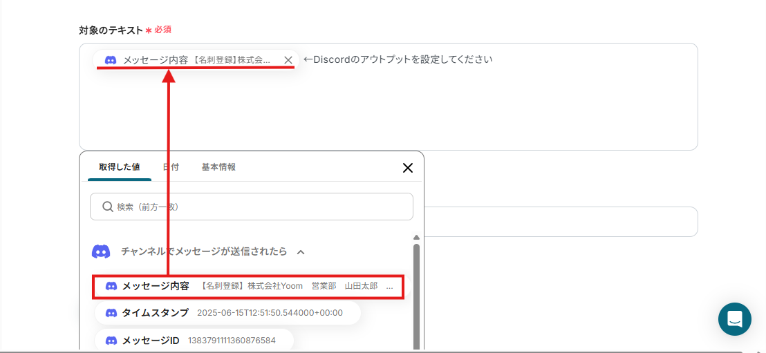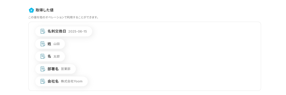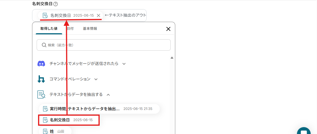 この設定により、Discordにメッセージが送信されたら、AIが抽出した「名刺交換日」を自動で取得しSansanの名刺交換日に反映することができますよ!