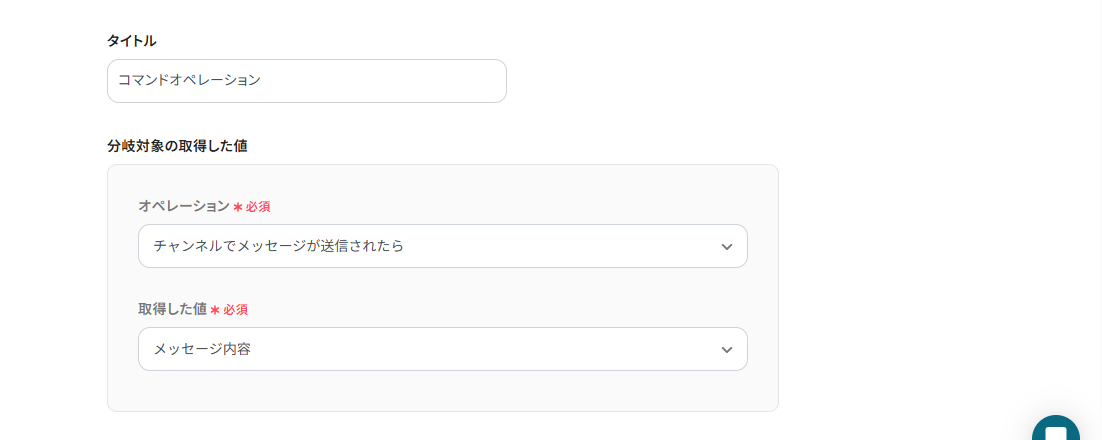 分岐対象の取得した値のオペレーションは、「チャンネルでメッセージが送信されたら」。