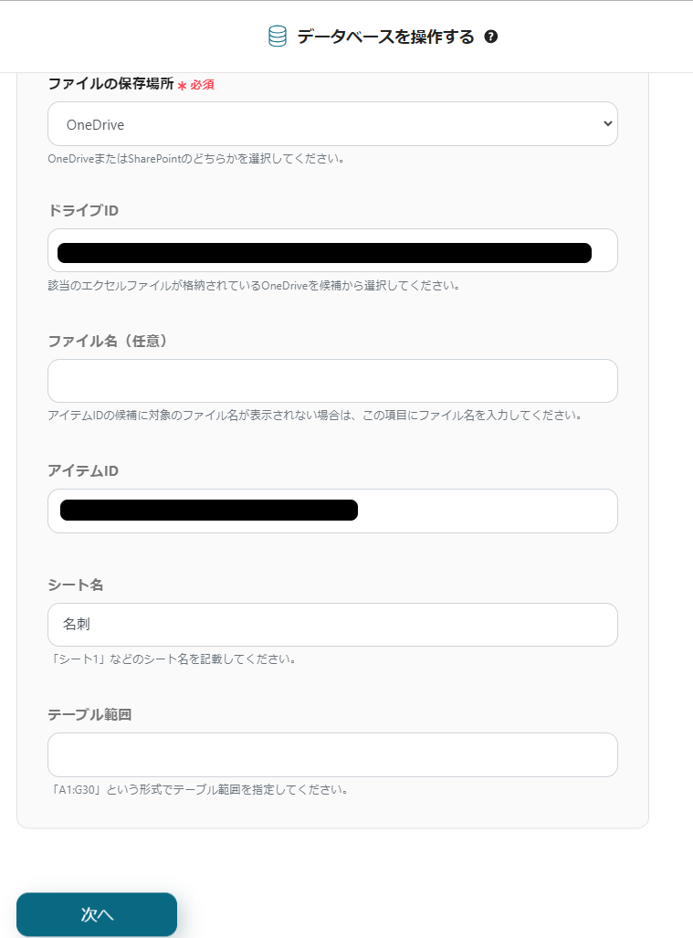 次のページでは、Microsoft Excelで更新する情報の詳細を設定します。