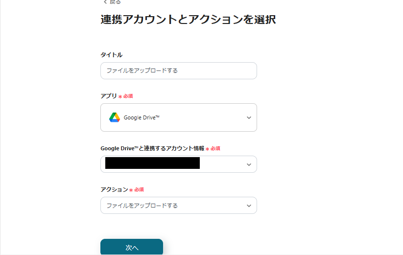 アクションが「ファイルをアップロードする」であることを確認し、進みましょう。
