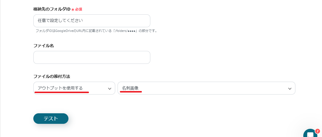 ファイルの添付方法は、上記のように「アウトプットを使用する」「名刺画像」と設定されているのを確認してください。