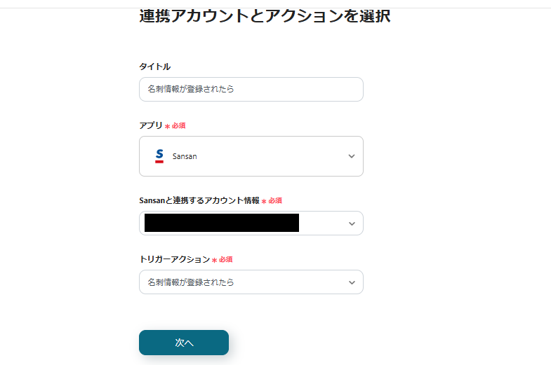トリガーアクションが「名刺情報が登録されたら」となっていることを確認し、進みましょう。
