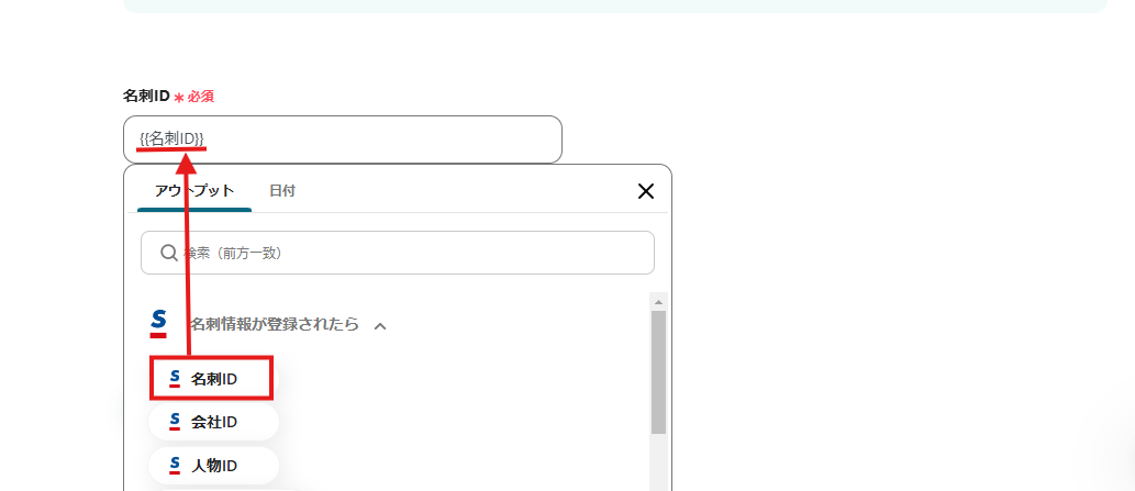 設定方法)枠内をクリックして、「名刺情報が登録されたら」の中にある「名刺ID」を選択してください。