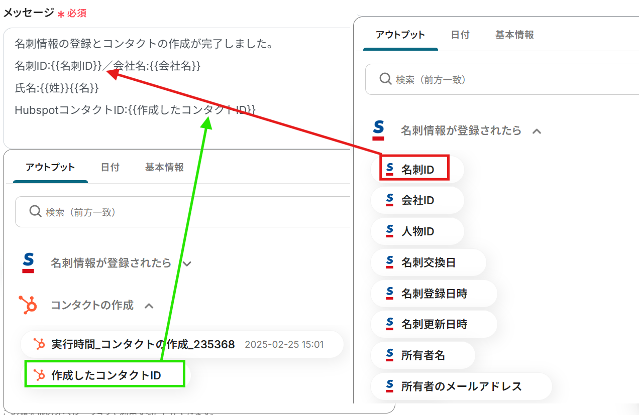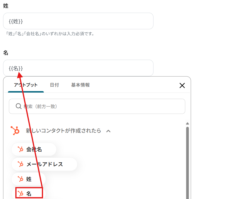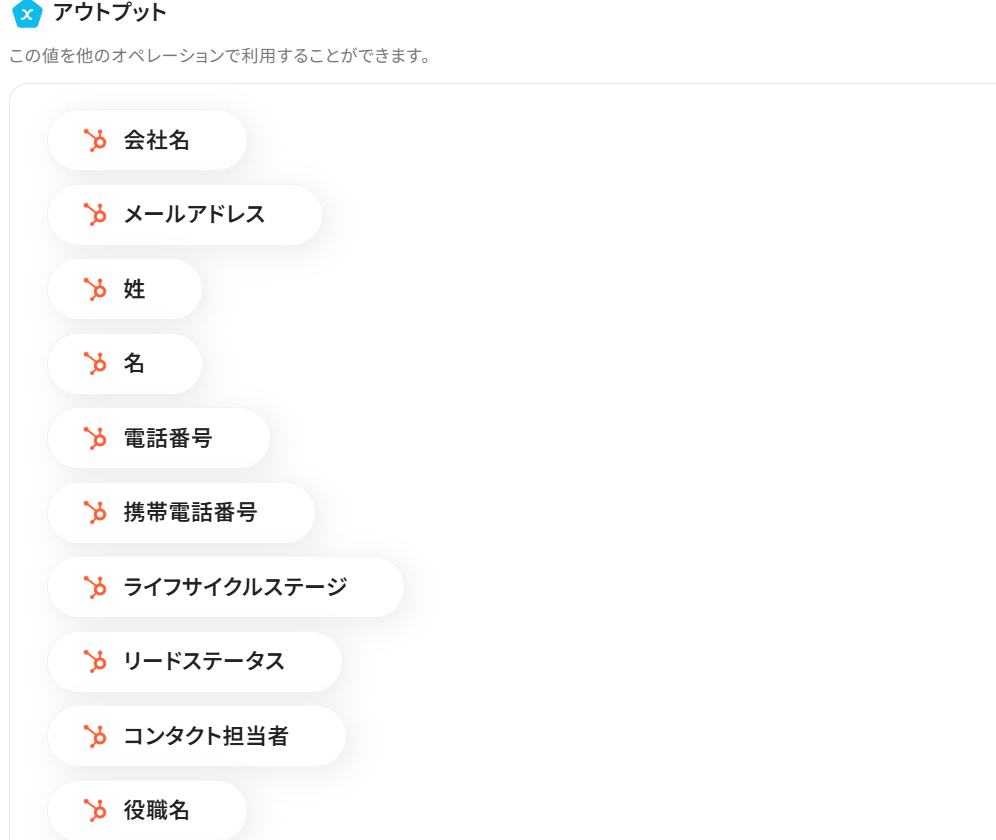 メニューが表示されたらSansanトリガーで取得したアウトプットから、HubSpotに登録したい項目を画像のように選択します。