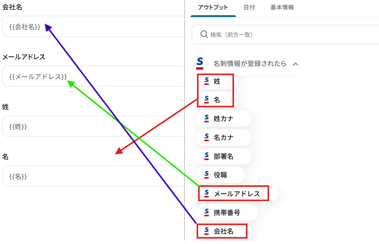 正しく連携できていると、アウトプットに名刺情報が取得できます。