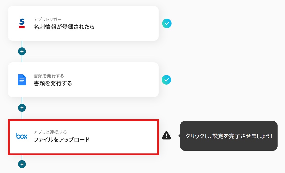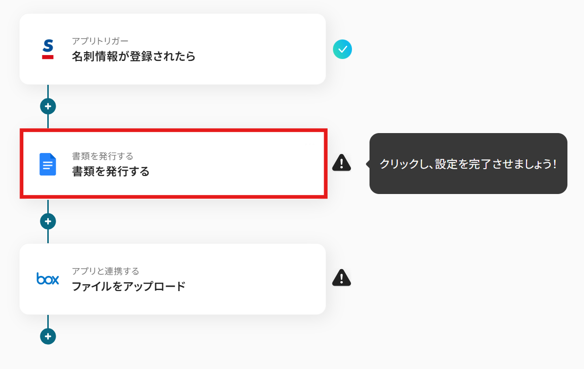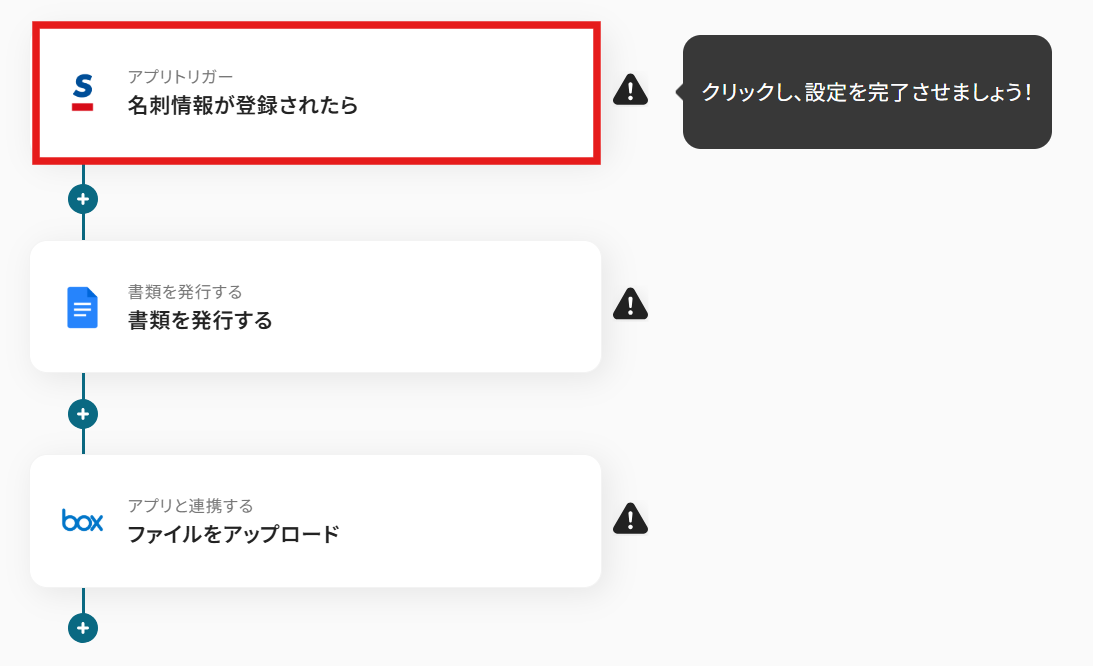 ここでは、具体的な例として「Sansanで名刺情報が登録されたら、契約書を発行しBoxに格納する」という自動化フローの作成手順を解説します。