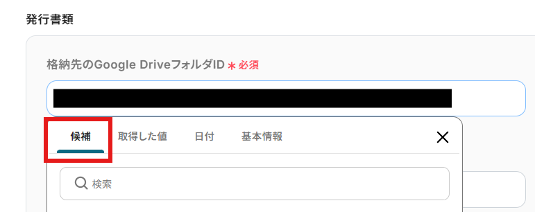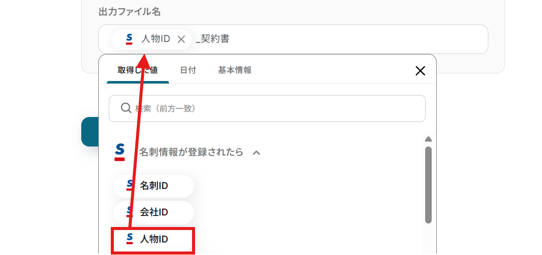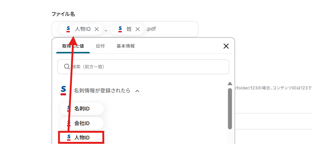 置換後の文字列は入力欄をクリックして、「名刺情報が登録されたら」「日付」の欄から引用していきます。