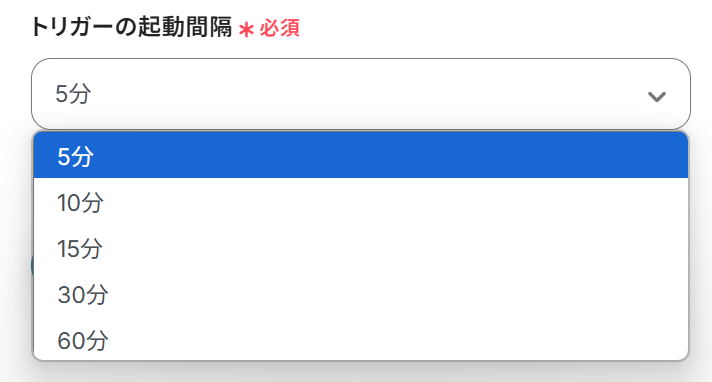 ・トリガーは5分、10分、15分、30分、60分の間隔で起動間隔を選択できます。