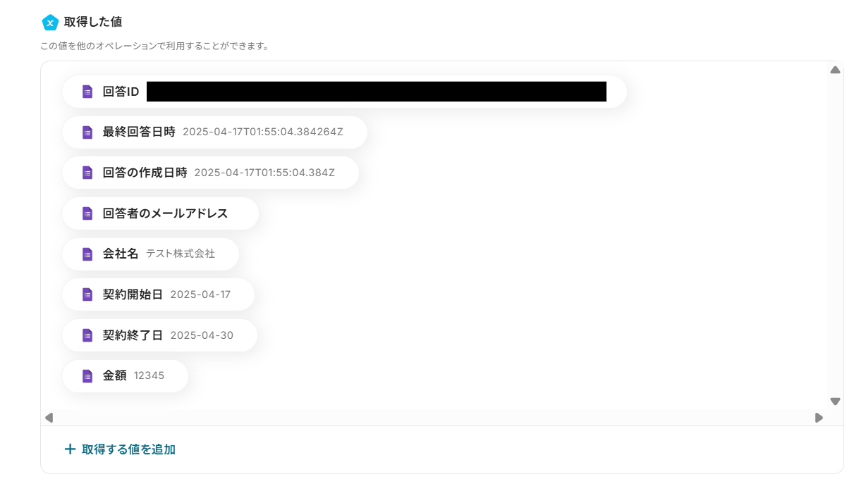 テストが成功すると「テスト成功」の画像が表示され、Sansanから取得した情報をアウトプットとして引用できるようになります。