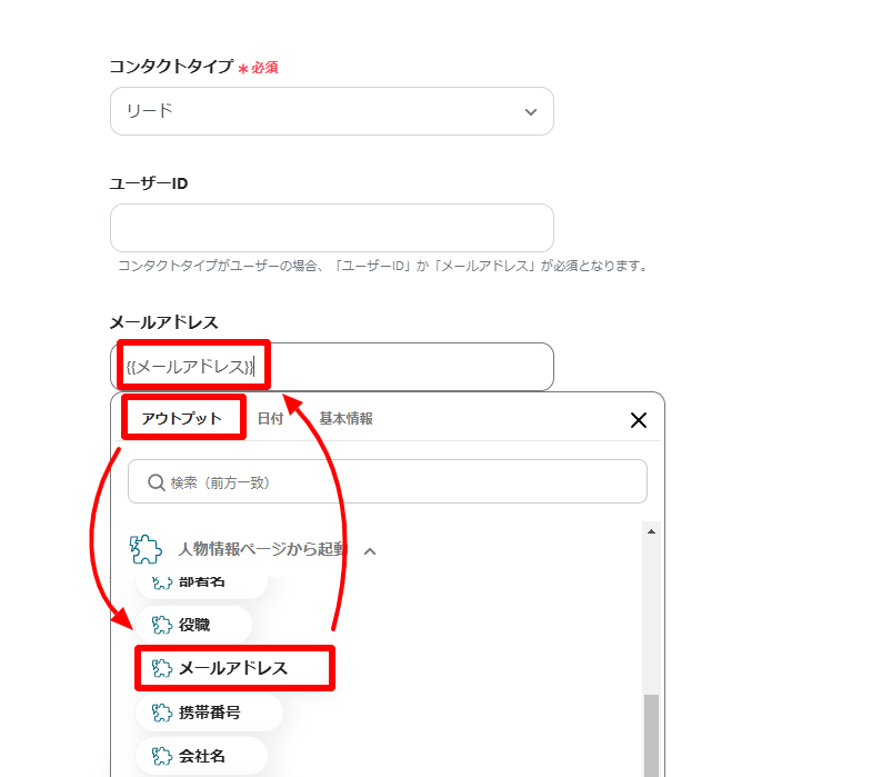 トリガーの設定で取得したアウトプットを各項目に反映させていきましょう。