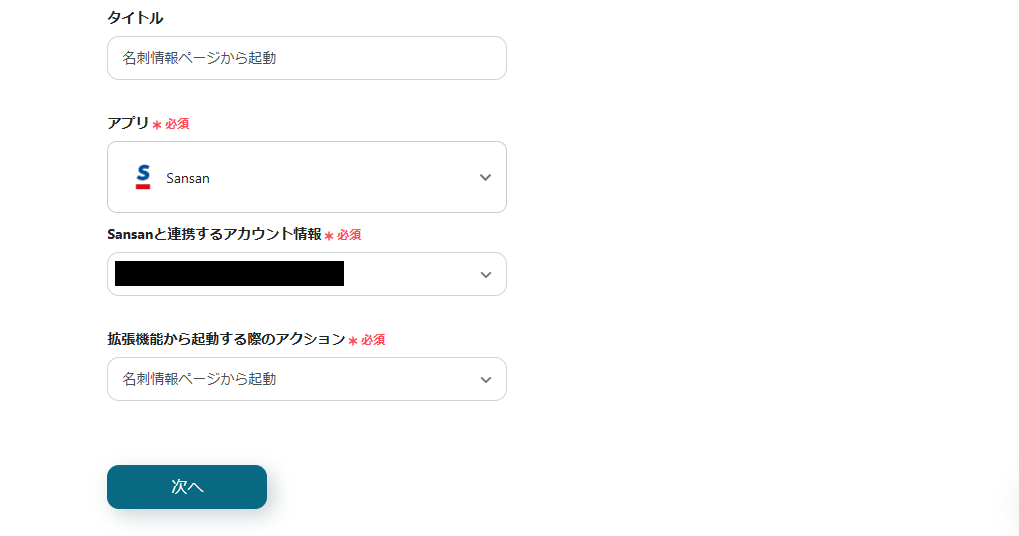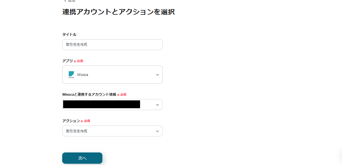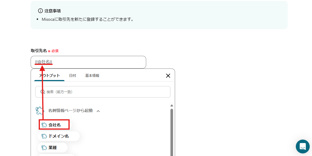 このように設定することで、Sansanの名刺情報ページから「会社名」を取得し、Misocaの「取引先名」に自動で転記することができます。
