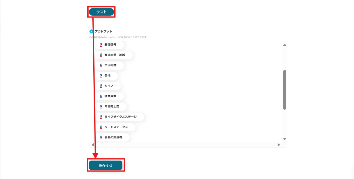 先ほど設定したSansanのURLサンプルから名刺情報がアウトプットされるので、確認後「保存する」をクリックしてください。
