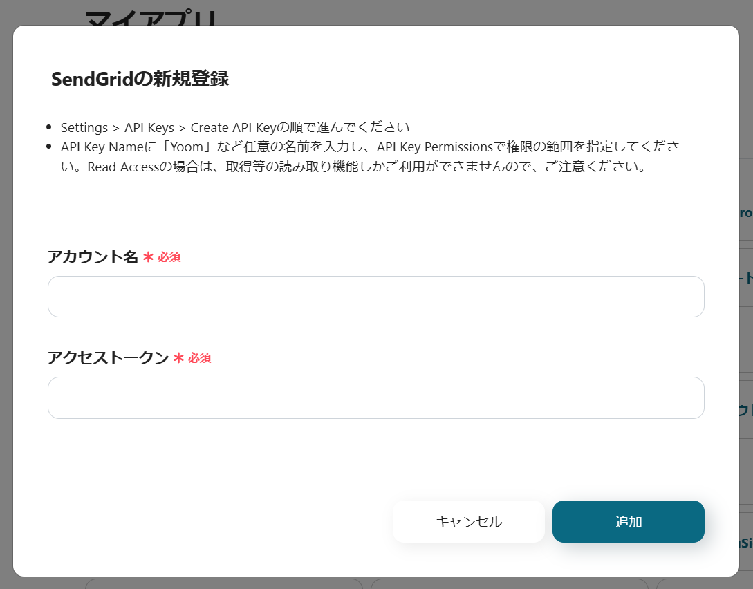 必須項目を入力します。詳しくはSendGridのAPIキー詳細ページにアクセスしてご確認ください。
