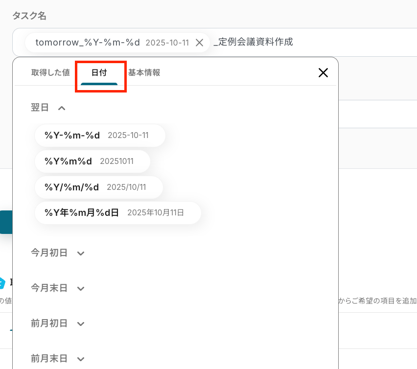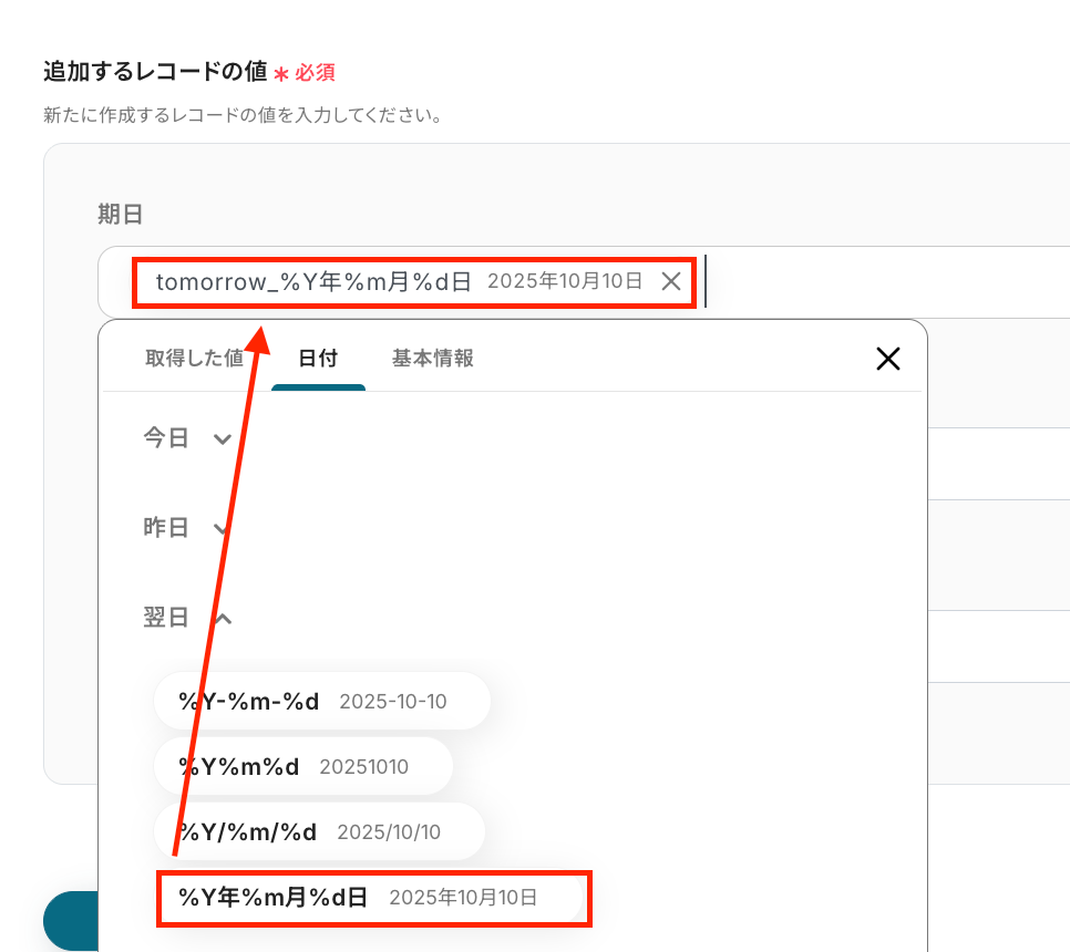 こうした日付を入れたい場合は、設定欄を入力して表示される「日付」の中から、フローを活用する業務内容に合わせて自由に選択してみてくださいね!