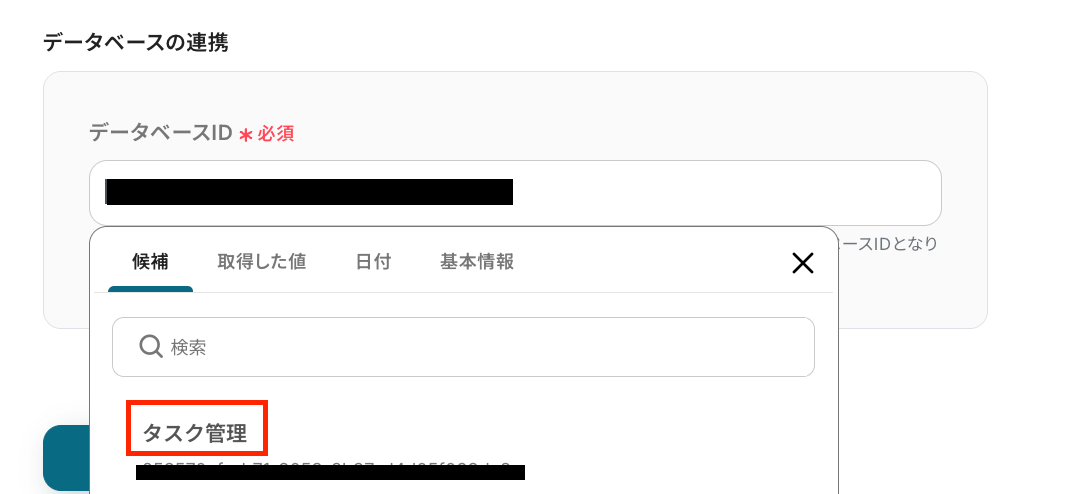 候補の中から該当のものを選択するか、入力欄下の注釈を参考にし、NotionのURLから値を確認して入力してくださいね!