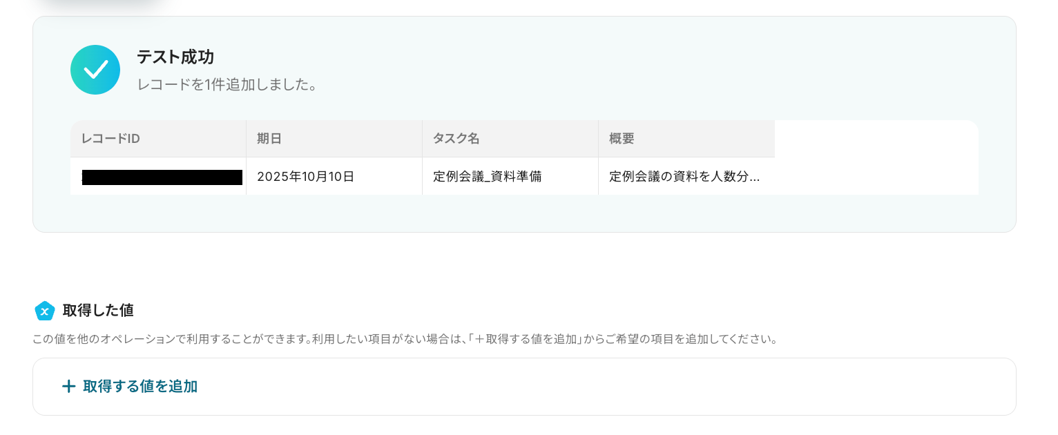 設定が完了したら「テスト」をクリックし、正常にNotionにデータを連携できるかを確認します。