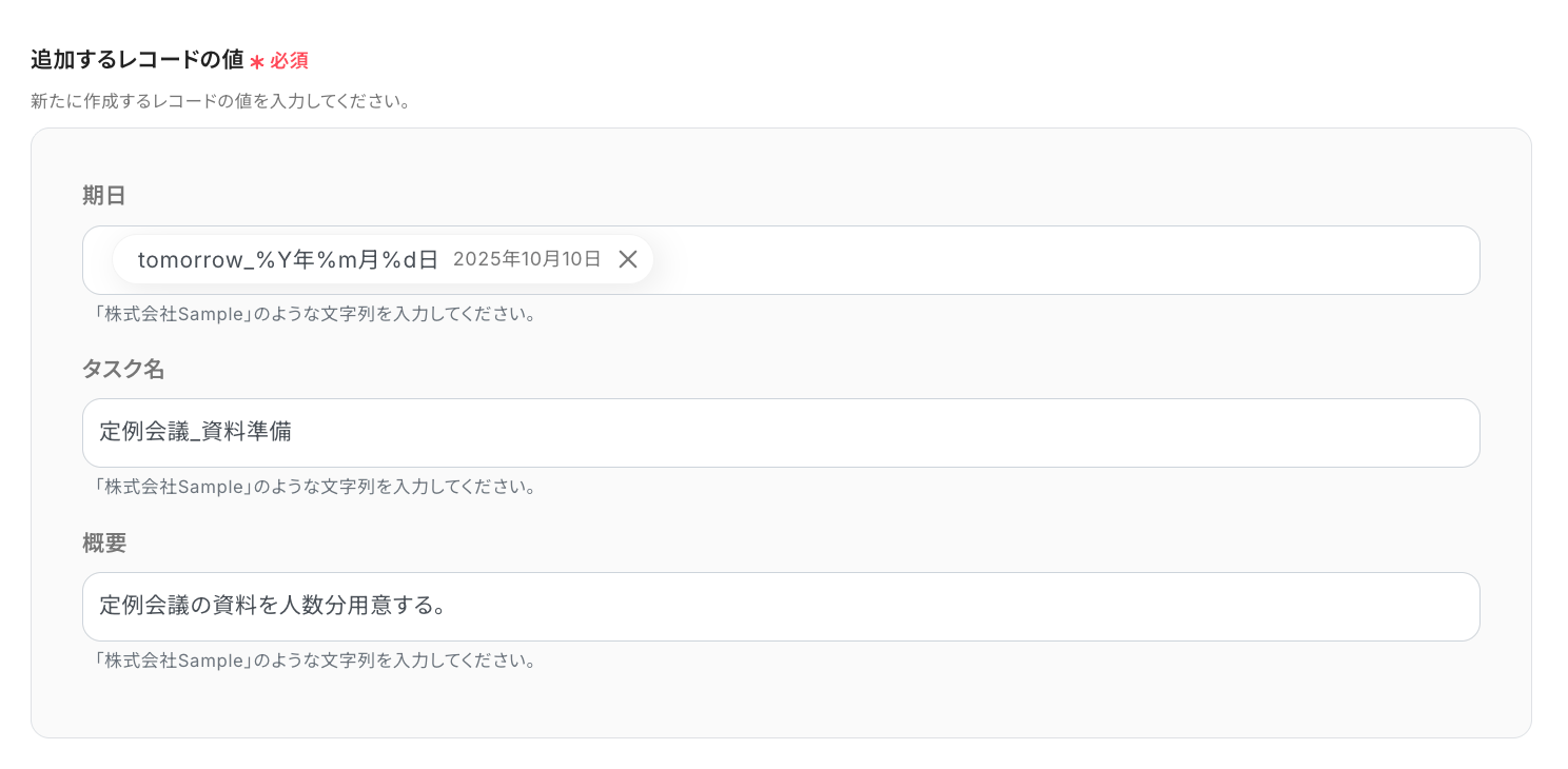 A:はい、Yoomにはフローを起動した「今日」や「翌日」、「今月末日」や「翌月末日」などの日付を自動で入力することが可能です。
