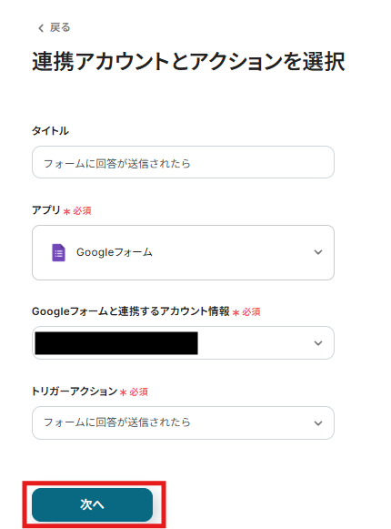 タイトルとトリガーアクションはあらかじめテンプレートで設定されている「フォームに回答が送信されたら」のままでOKです。