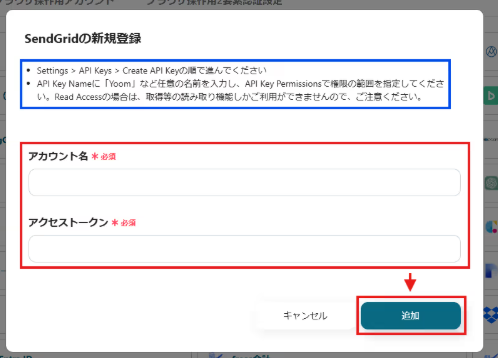 候補の中から「SendGrid API」を選択し、アカウントとアクセストークンを入力し「追加」をクリックします。