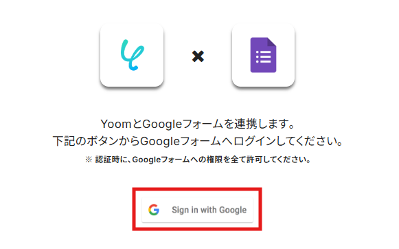 Googleフォームも先程のSendGridと同様、マイアプリメニューからアプリを検索し選択すると下記の画面が表示されるので「Sign in with Google」をクリック。