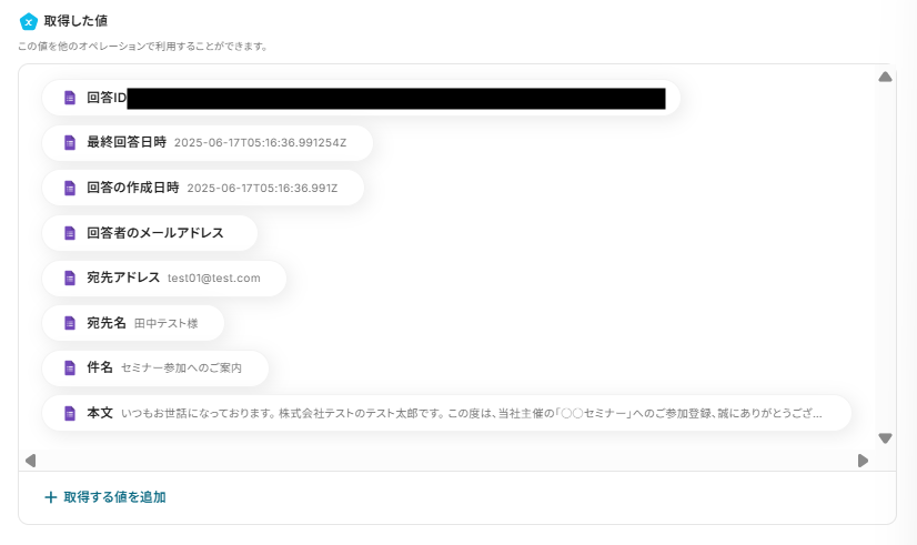 テストに成功すると「取得した値」の各項目の横にGoogleフォームから取得した情報が表示されます。